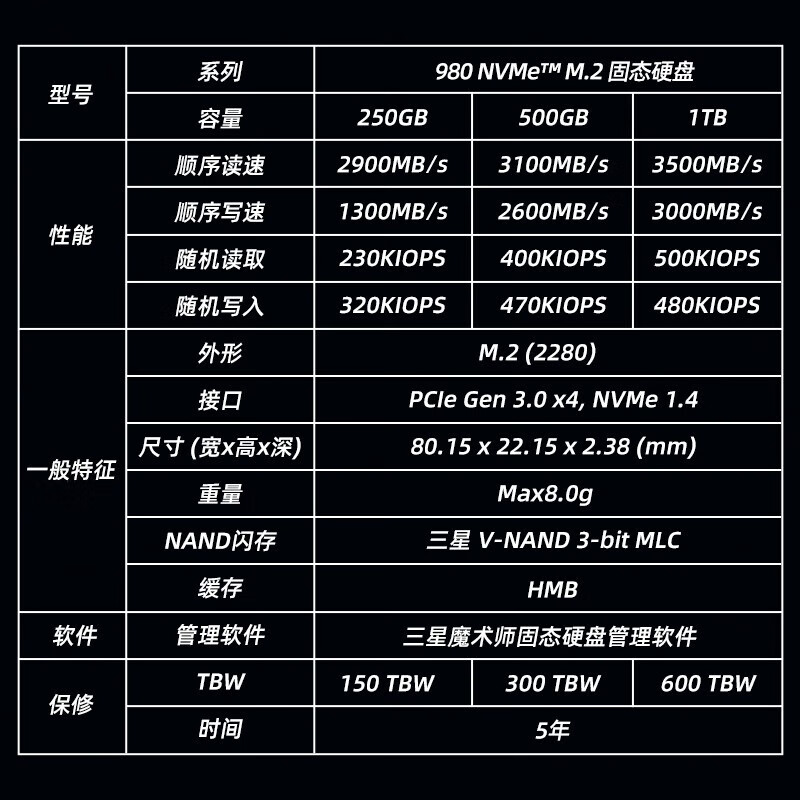 三星1TB SSD固态硬盘 M.2接口(NVMe协议) AI电脑配件 读速3500MB/S 980