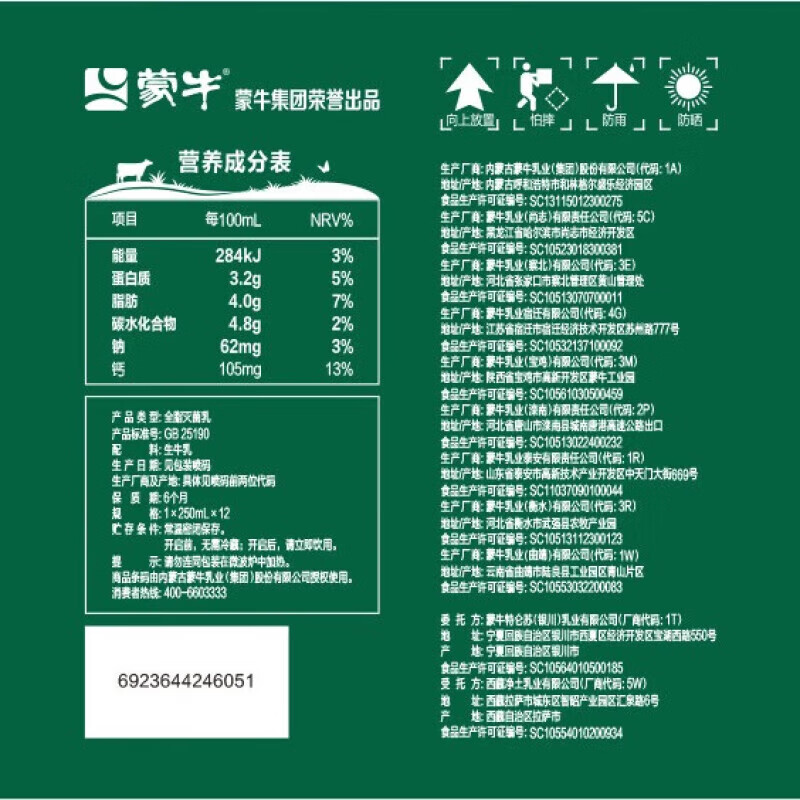 蒙牛精选牧场纯牛奶全脂灭菌乳利乐苗条装250ml×12包