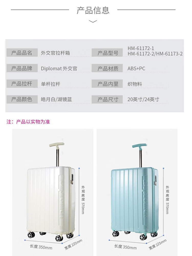 Diplomat外交官时尚单杆轻盈旅行箱HM-61172/61173 湖镜蓝20英寸-