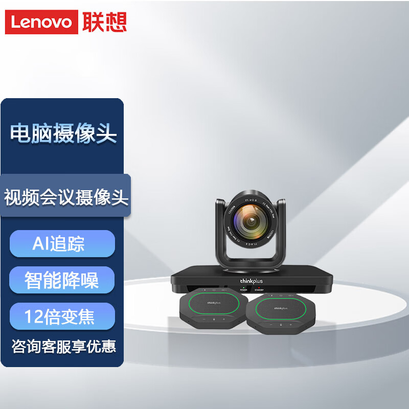 联想(Lenovo)ThinkPlus视频会议解决方案适用20-80平米12倍AI跟踪多接口摄像头无线一拖二级全向会议麦克风套装