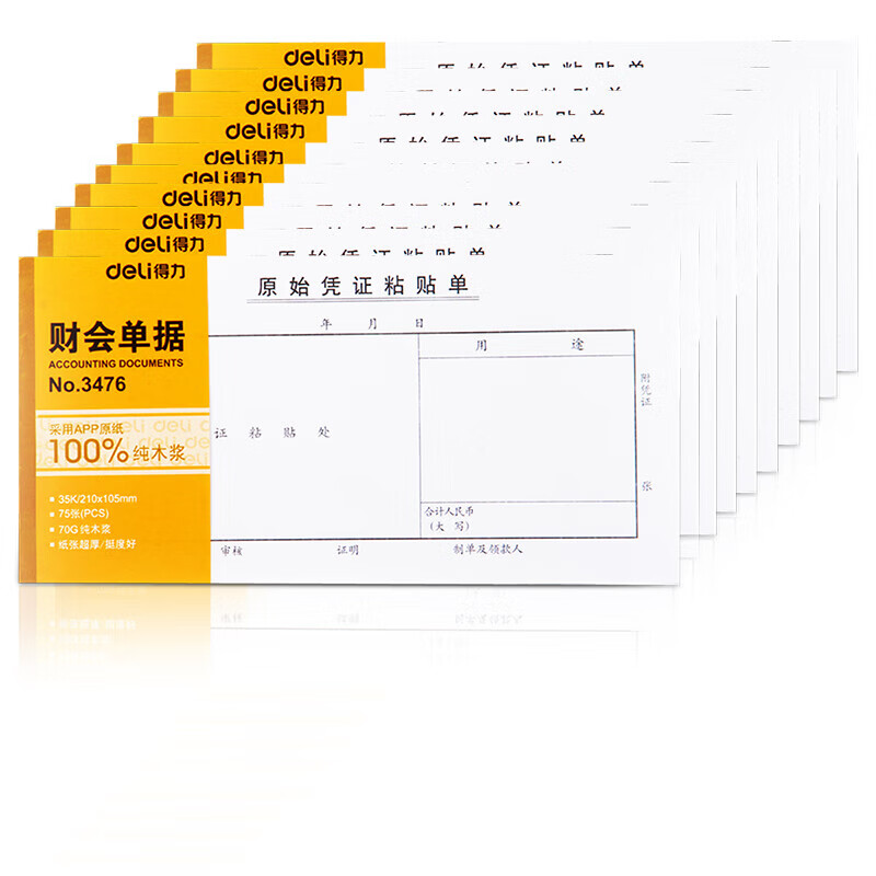 得力(deli)10本装210*105mm原始凭证粘贴单 75张/本 通用财务手写单据票据 3476 本