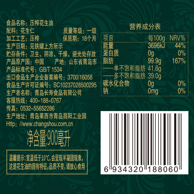 第一坊 冷榨有机花生油 900ml*2礼盒